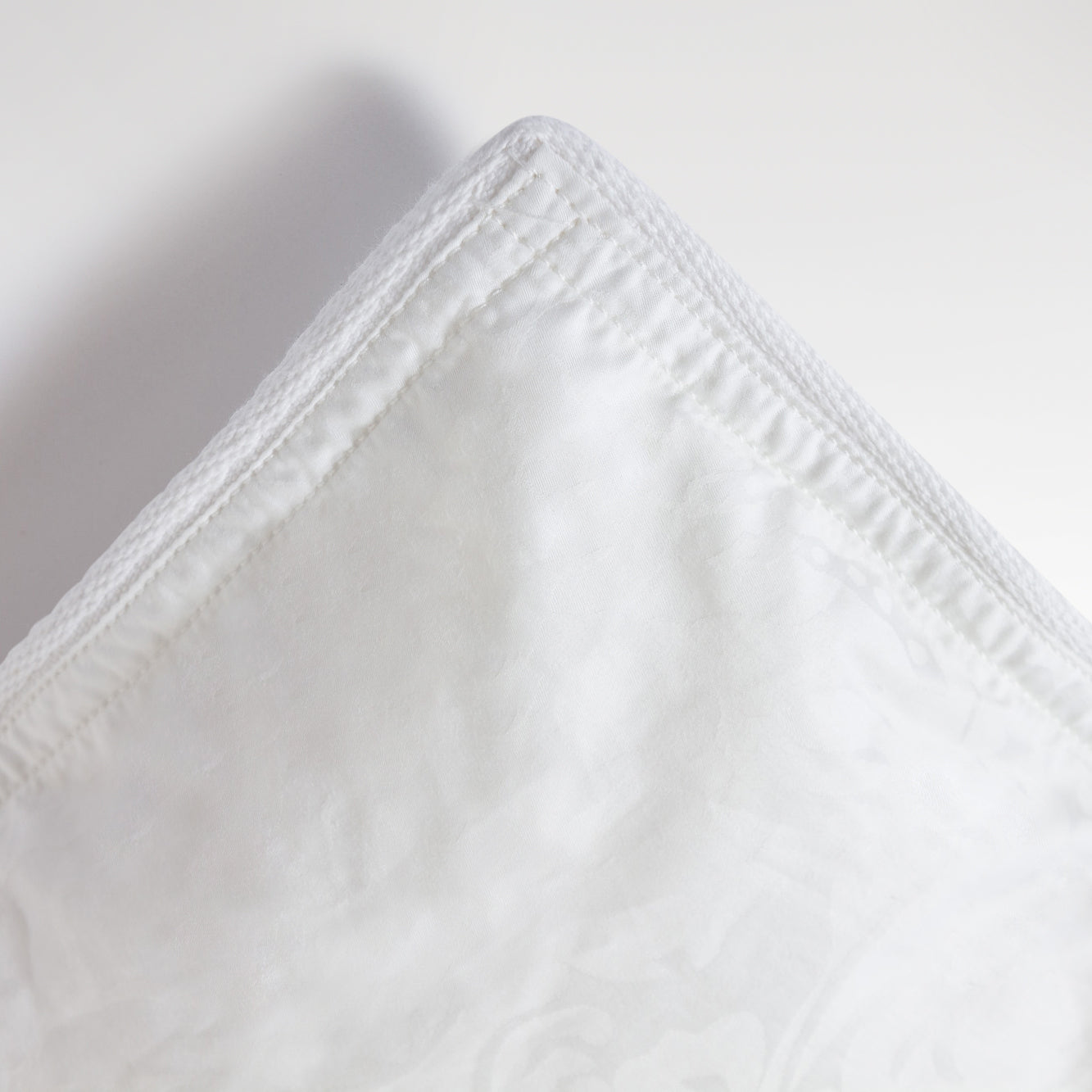 Pokrycie z eleganckiej, 100% białej bawełny żakardowej zapewnia nie tylko wyjątkową estetykę, ale także trwałość i komfort snu. Żakardowy wzór podkreśla luksusowy charakter kolekcji, a naturalne materiały są przyjazne dla skóry i gwarantują odpowiednią cyrkulację powietrza.